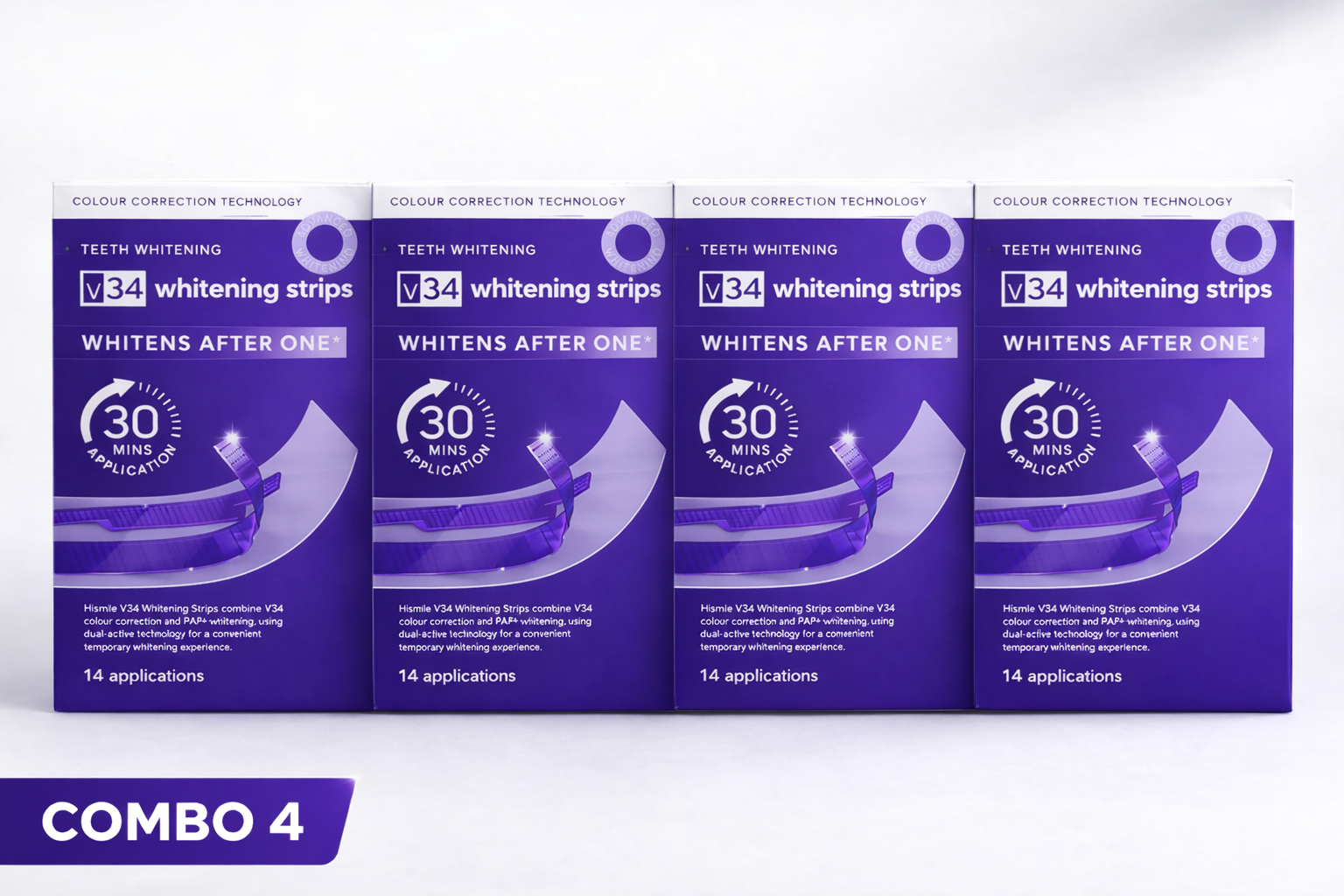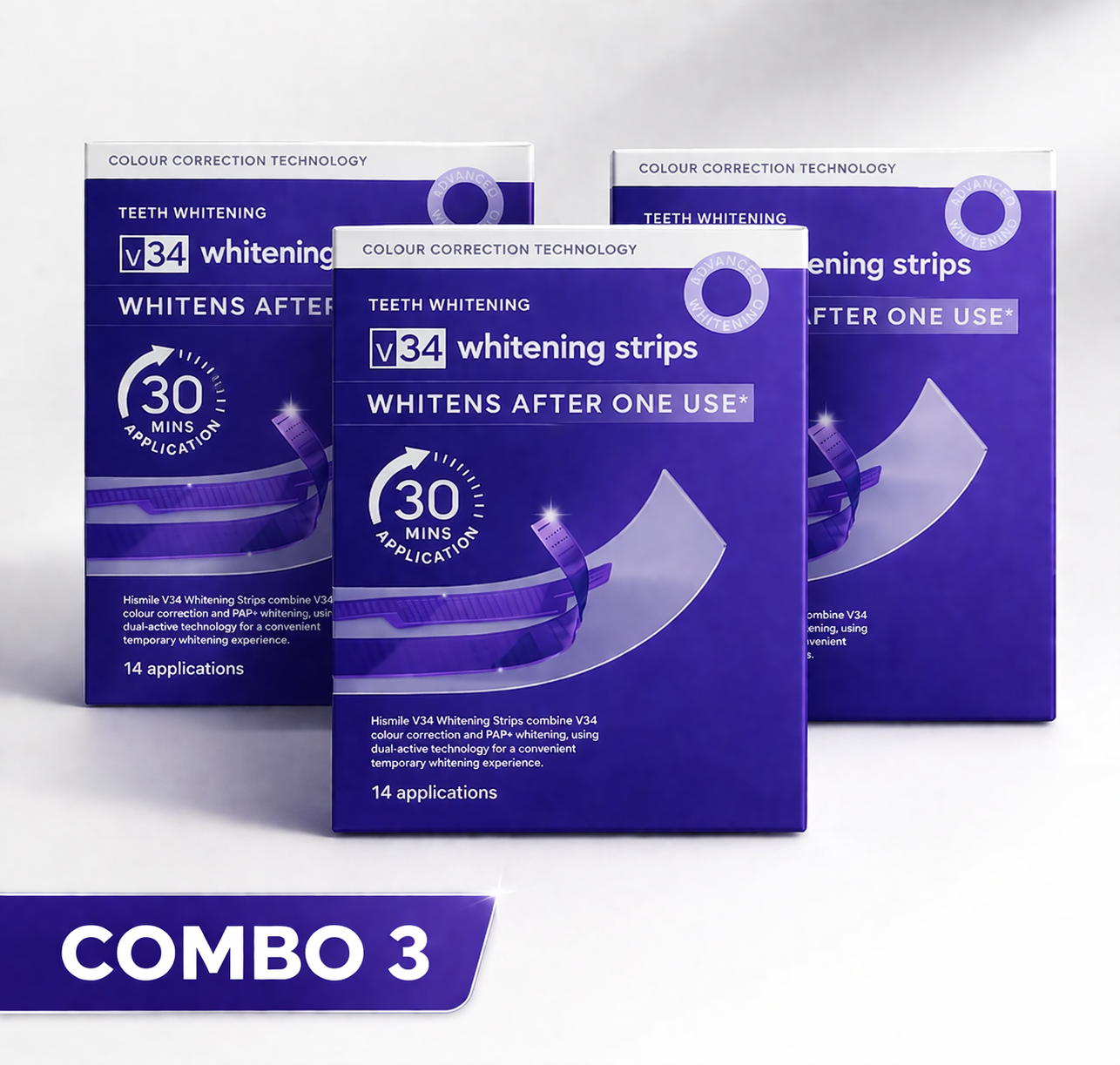 Purple color-correcting technology neutralizes yellow tones on contact. See visibly brighter teeth the moment you remove the strips.